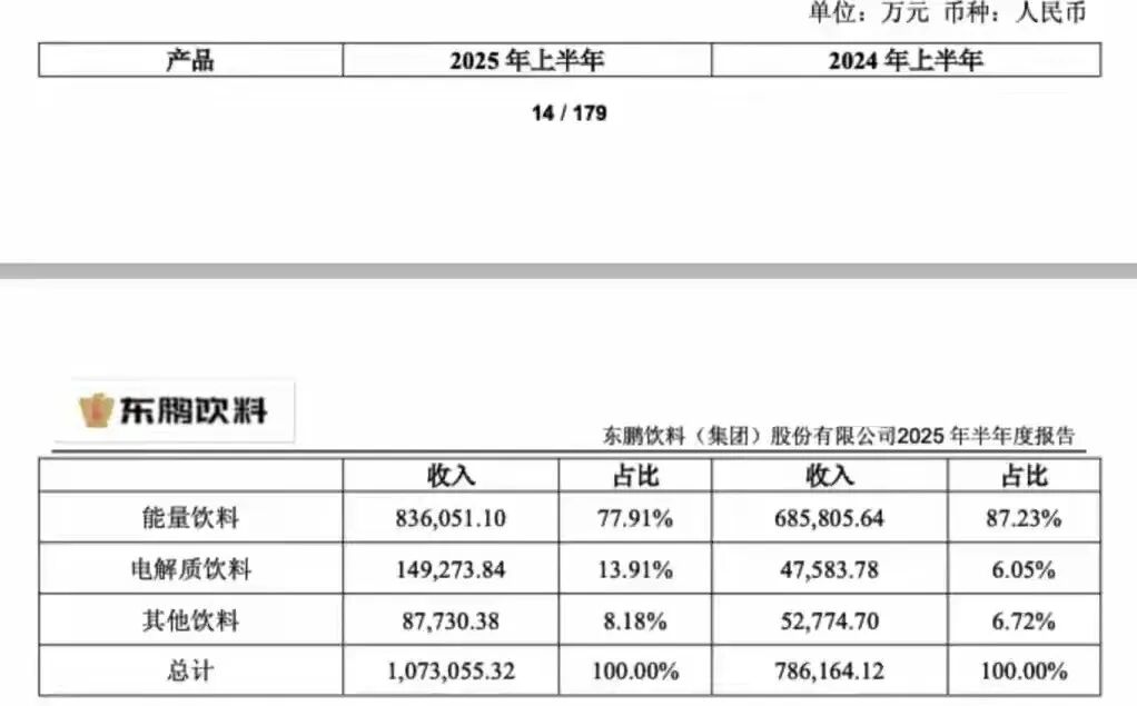 放大來(lái)看,據(jù)公開財(cái)報(bào)資料,2025年上半年,以東鵬特飲為主的能量飲料收入約83.60億元,占總營(yíng)收的77.91%,上年同期占比為87.23%,1-9月合計(jì)下降為74.63%;“東鵬補(bǔ)水啦”年中收入為14.93億元,同比增長(zhǎng)213.7%,占總收入的比重達(dá)到13.9%,1-9月合計(jì)提升至本年16.91%;其他諸如東鵬大咖、茉莉茶飲等品類合計(jì)占比在年中和前三季度均不足10%。