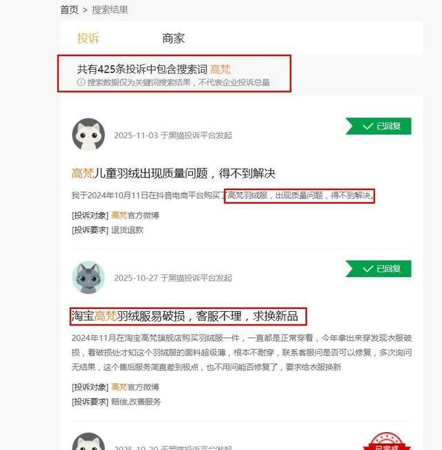 在黑貓平臺,包含高梵的搜索詞有425條,其中不乏與產(chǎn)品質(zhì)量和售后服務(wù)直接相關(guān)的投訴,另有線上消費(fèi)者評價顯示,高梵部分產(chǎn)品存在面料薄、跑絨、開線等問題。高端定位若缺乏與之匹配的品質(zhì)&售后水平支撐,口碑的崩塌或只是時間早晚。