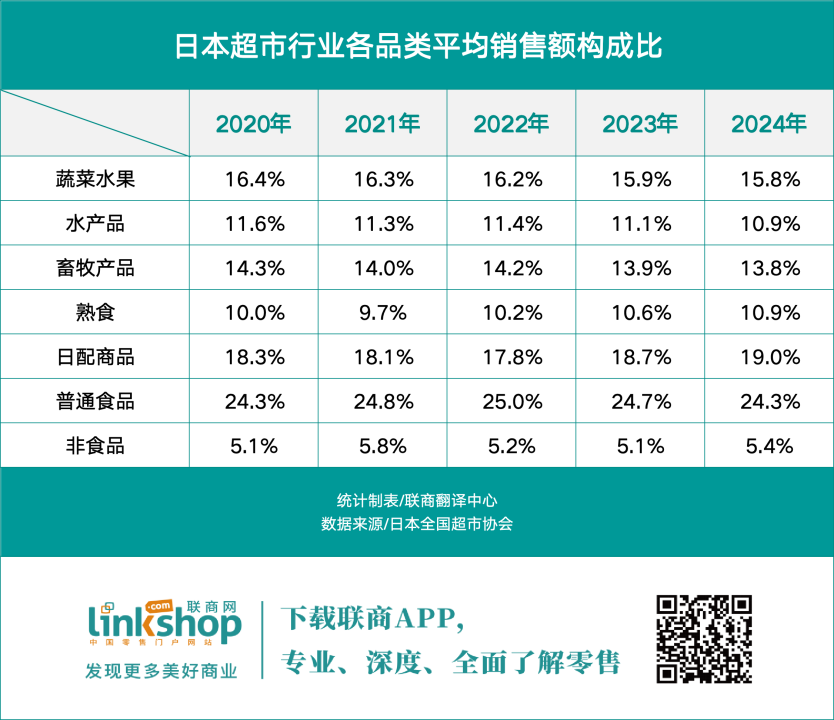 2020至2024年間,日本超市行業(yè)的銷售結(jié)構(gòu)總體穩(wěn)定,但內(nèi)部板塊的此消彼長(zhǎng),已反映出家庭消費(fèi)行為的明顯轉(zhuǎn)向。