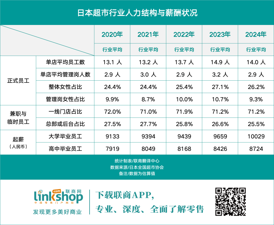 從2020年至2024年,日本超市行業(yè)的人事環(huán)境呈現(xiàn)出“人力規(guī)模穩(wěn)定、女性占比上升、薪資溫和增長(zhǎng)”的總體趨勢(shì)。單店平均正式員工約14人、管理崗約3人,結(jié)構(gòu)相對(duì)固定;女性員工比例從24.4%升至26.2%。