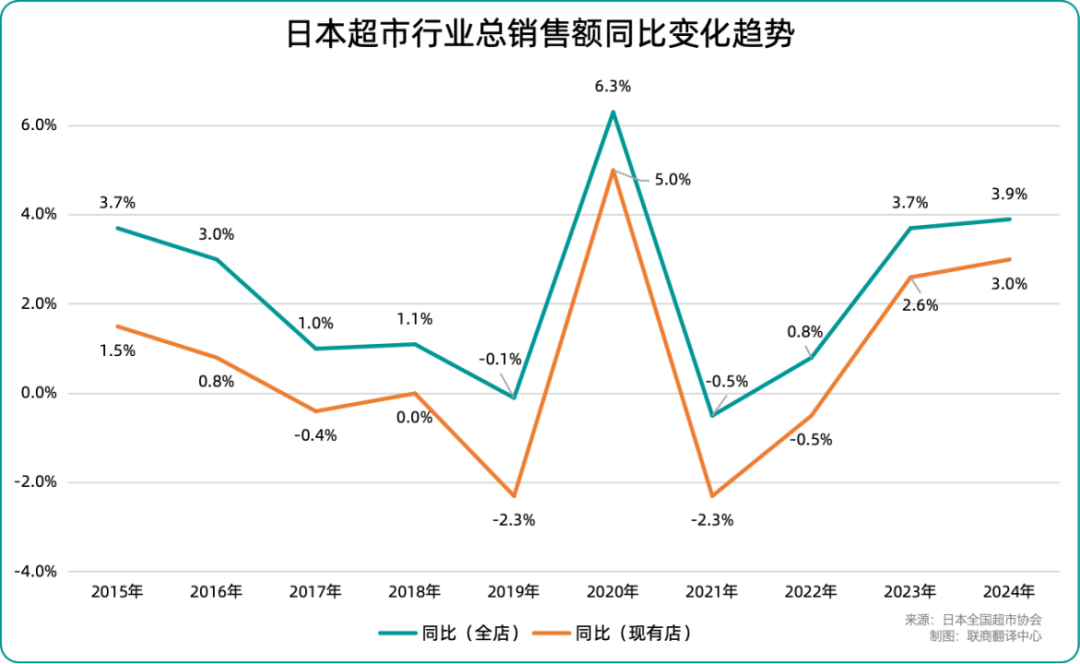 截至2024年底,日本超市行業(yè)總銷售額按可比口徑計(jì)算約為1.2萬(wàn)億元人民幣(注:文中金額均已按1日元=0.0473人民幣的匯率換算),同比增長(zhǎng)3.9%。至此,行業(yè)銷售額已在全店層面實(shí)現(xiàn)連續(xù)三年增長(zhǎng),在現(xiàn)有店鋪層面也連續(xù)兩年錄得正增長(zhǎng)。