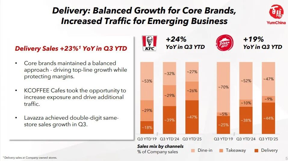 財(cái)報(bào)顯示,百勝中國(guó)在第三季度外賣銷售額同比增長(zhǎng)23%,約占公司總銷售額的51%,去年同期僅為40%。