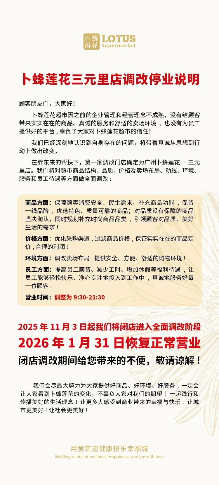 根據(jù)公告,卜蜂蓮花在反思中坦言,過(guò)去因企業(yè)管理與經(jīng)營(yíng)理念不成熟,未能為顧客提供優(yōu)質(zhì)商品、真誠(chéng)服務(wù)和舒適的購(gòu)物環(huán)境,也未搭建良好的員工發(fā)展平臺(tái)。為此,在胖東來(lái)專業(yè)團(tuán)隊(duì)的助力下,三元里店將從四大維度推動(dòng)全面轉(zhuǎn)型: