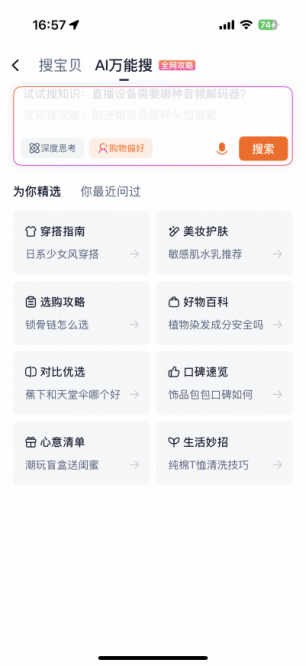 「AI萬(wàn)能搜」能精準(zhǔn)理解復(fù)雜語(yǔ)義表述(例如:“如何清理下水道小飛蟲”“貓狗雙全的家庭用什么貓砂盆”等),并提供購(gòu)物攻略;「AI幫我挑」通過(guò)對(duì)話引導(dǎo)精準(zhǔn)篩選商品;「拍立淘」則升級(jí)為多模態(tài)AI搜索,并為消費(fèi)者實(shí)現(xiàn)同款價(jià)優(yōu)、同類商品推薦,等等。
