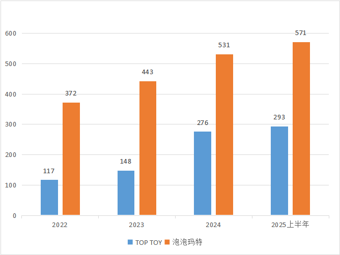 圖:2022年-2025年上半年TOP TOY與泡泡瑪特門(mén)店數(shù)量對(duì)比(含海外市場(chǎng));數(shù)據(jù)來(lái)源:企業(yè)財(cái)報(bào),36氪