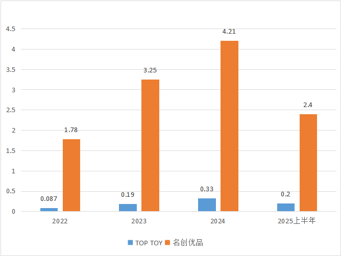 圖:2022-2025年上半年名創(chuàng)優(yōu)品與TOP TOY授權(quán)費(fèi)用對(duì)比(單位:億元);資料來(lái)源:公司財(cái)報(bào),36氪