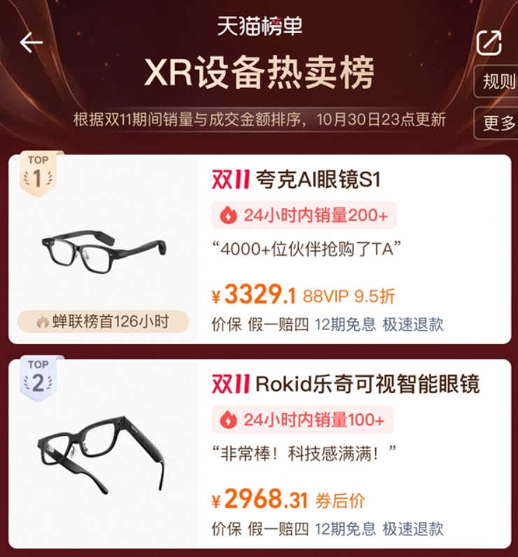 Rokid躋身XR設(shè)備雙11熱賣(mài)榜前2