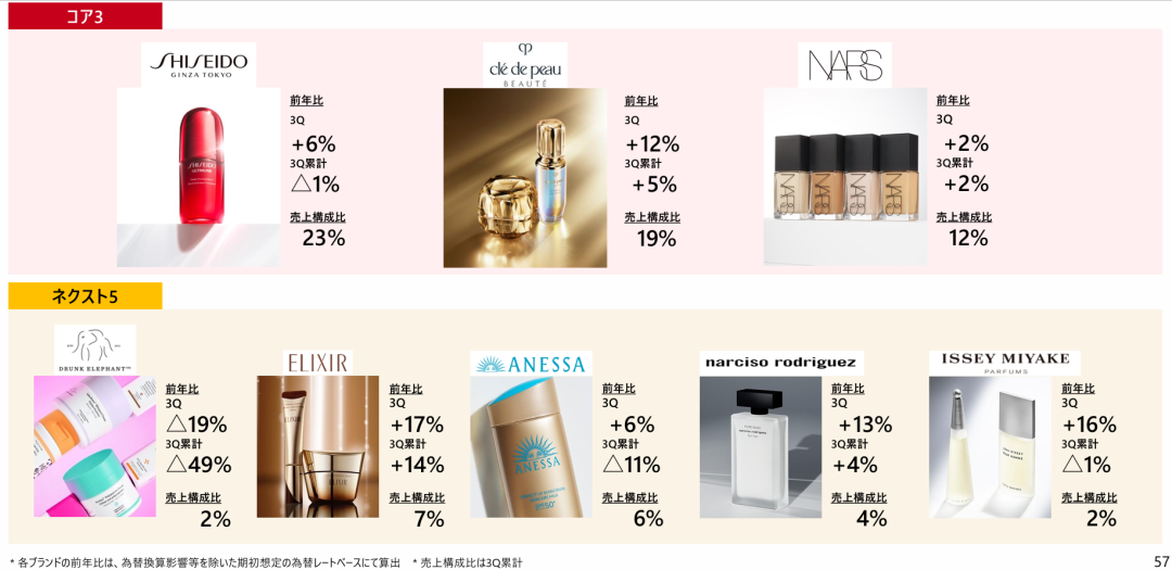 Core 3品牌(即3大核心品牌)中,從第三季度業(yè)績表現(xiàn)來看,資生堂品牌、肌膚之鑰、NARS三個品牌銷售額均實(shí)現(xiàn)增長,且分別較上年同期增長6%、12%、2%。但由于今年上半年表現(xiàn)不佳,資生堂品牌在前三季度銷售額同比略降1%。