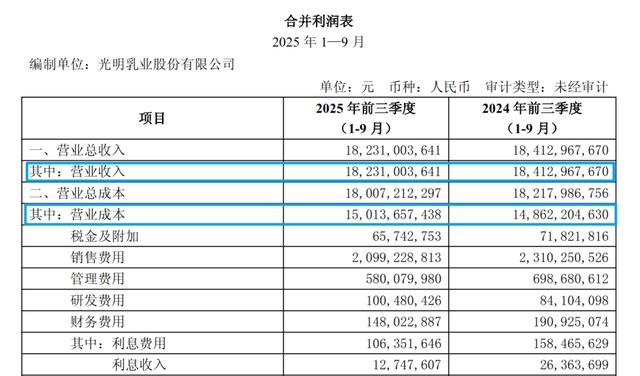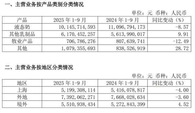 然而,自2004年被蒙牛反超之后,光明就徹底從“神壇”跌落,與蒙牛的差距越拉越大,營收更是只有千億巨頭伊利的零頭,在2022-2024連跌3個財年之后,最新公布2025年三季度財報,仍充斥著幾分寒意: