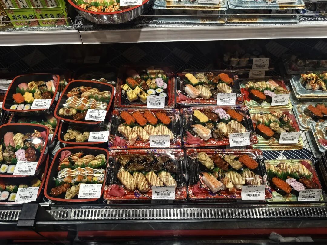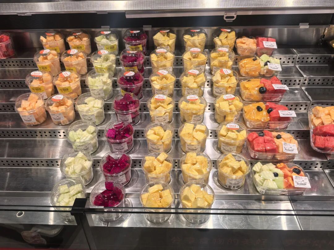 超市入口主通道左手開始是烘焙區(qū)、熟食加工區(qū)、水產(chǎn)區(qū)、面區(qū)、右手是食品、生鮮和水果區(qū)。