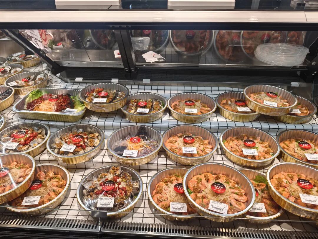 水產(chǎn)區(qū)和餐飲區(qū)緊鄰,設(shè)置了專門的就餐區(qū),雖然當(dāng)時已經(jīng)是下午三點左右,但水產(chǎn)區(qū)人潮涌動,整個就餐區(qū)依然有依稀的身影在就餐,這是門店提供的一項海鮮水產(chǎn)加工服務(wù)。