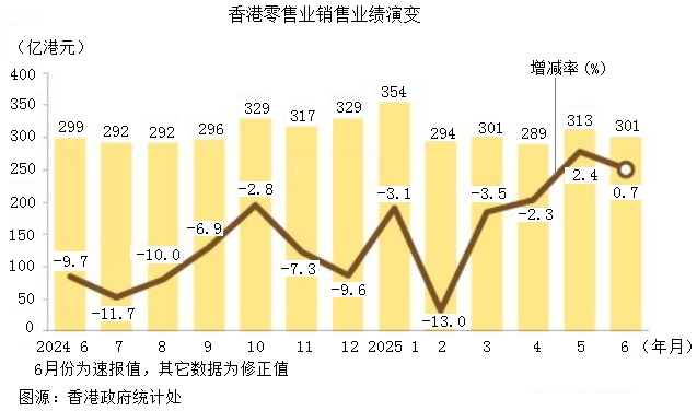 今年7月31日,香港官方發(fā)布6月份零售業(yè)銷售額301億港元(約275.75億人民幣),同比增長0.7%,5月份同比增2.4%,保持兩個月增長。主要品類中,珠寶、腕表、高級禮品業(yè)績同比增長6.8%,衣料品、鞋包等業(yè)績下降4.7%。網絡銷售25.45億港元(約23.31億人民幣),增長8.4%。就2025年上半年(1至6月)總體看,零售行業(yè)銷售業(yè)績?yōu)?851.44億港元(約1696.08億人民幣),同比下降3.3%。