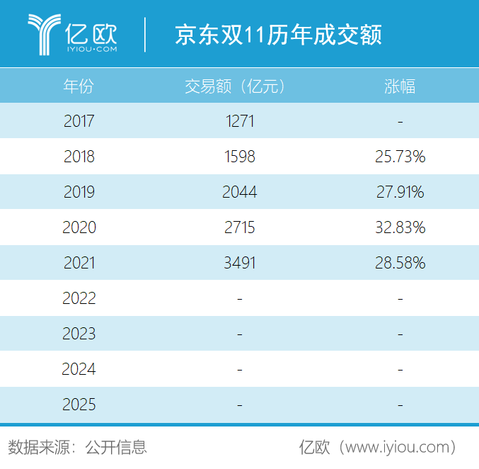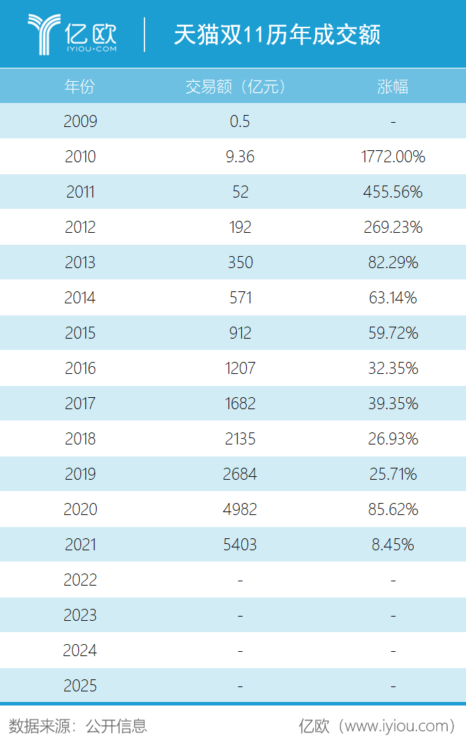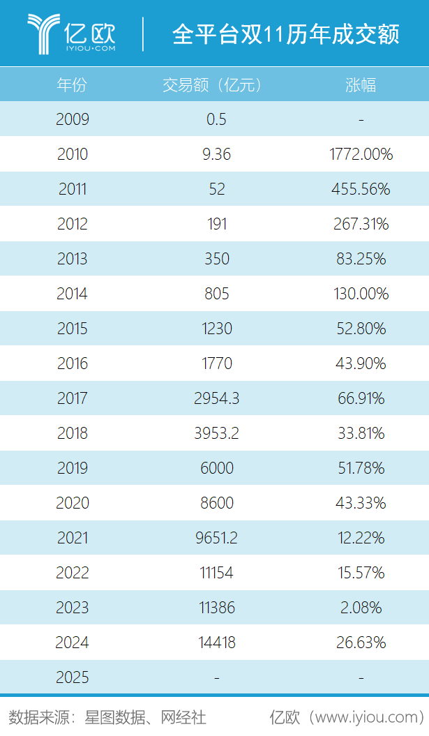 十幾年間,雙11交易規(guī)模一路狂飆:2010年成交額增長至9.36億元,2012年突破百億大關(guān),2015年邁入千億梯隊。此后增速雖偶有波動,但整體處于規(guī)模擴張、增速震蕩的狀態(tài)。