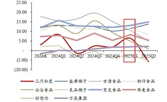 2023A-2025Q2主要休閑食品企業(yè)歸母凈利率
