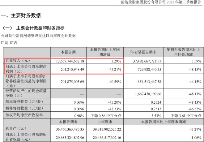 韻達(dá)在2025年第三季度實(shí)現(xiàn)營業(yè)收入126.60億元,同比增長3.29%,遠(yuǎn)遠(yuǎn)低于申通和圓通的同比增速;歸屬于上市公司股東的凈利潤2.01億元,同比下滑45.21%。