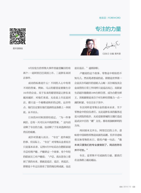 或許對普通人而言,“專注”是件瘋狂的事。但實際上,“專注”對零售從業(yè)者而言只是基本訴求。記得9月中旬采訪合肥聯(lián)家超市總經(jīng)理盧健,盧健講過一個故事。有個年輕的聯(lián)家員工對盧健說:“盧總,我從您身上看到了我的未來,那就是巡店、巡店、再巡店,即便是十年過后我有了您的地位和成就,也還是在巡店。”遂即辭職。