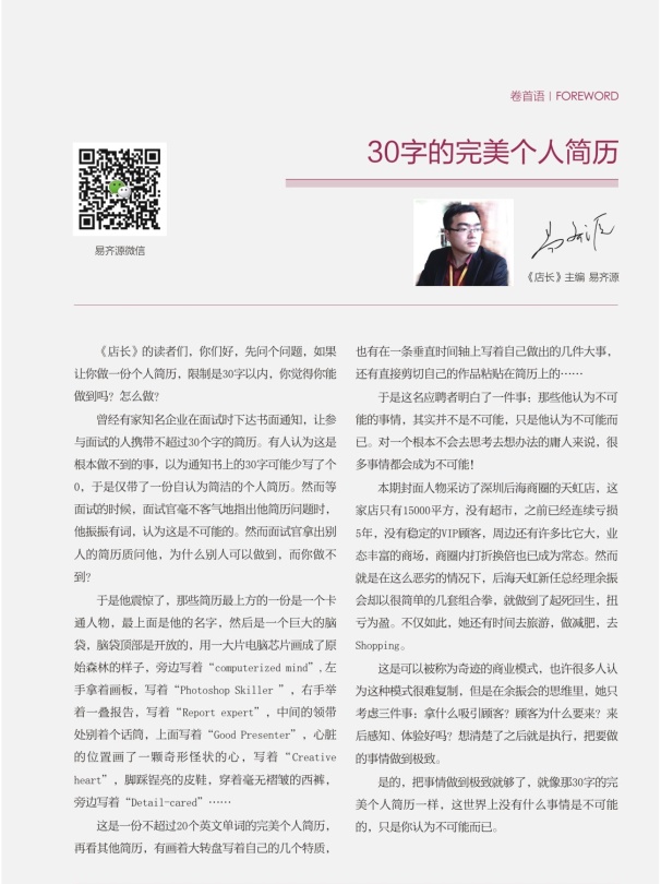 《店長》的讀者們,你們好,先問個(gè)問題,如果讓你做一份個(gè)人簡歷,限制是30字以內(nèi),你覺得你能做到嗎?怎么做?