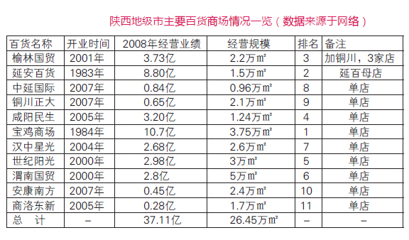 陜西的地級(jí)市百貨業(yè)發(fā)展相對(duì)較緩,這和西北的人口組成及地理環(huán)境有很大關(guān)系。至今發(fā)展較好的,除了開元和民生的分支機(jī)構(gòu),還有榆林國貿(mào)百貨、延安百貨大樓和中延國際、銅川正大百貨、咸陽民生百貨、寶雞商場、渭南國貿(mào)百貨、漢中星光百貨和世紀(jì)陽光、安康南方百貨和商洛東新百貨等。