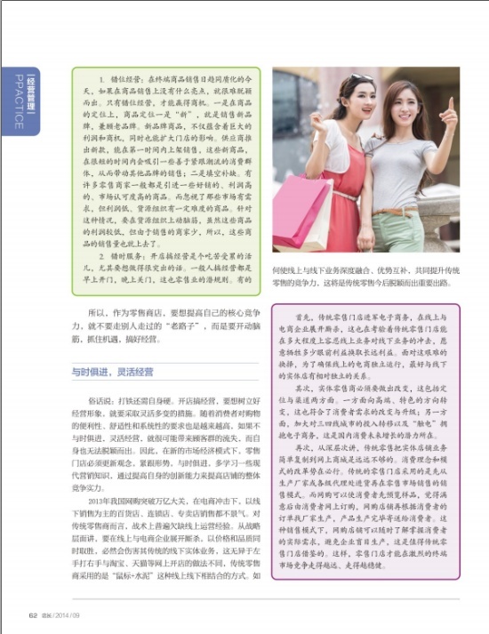 所以,作為零售商店,要想提高自己的核心競(jìng)爭(zhēng)力,就不要走別人走過(guò)的“老路子”,而是要開(kāi)動(dòng)腦筋,抓住機(jī)遇,搞好經(jīng)營(yíng)。 與時(shí)俱進(jìn),靈活經(jīng)營(yíng) 俗話說(shuō):打鐵還需自身硬。開(kāi)店搞經(jīng)營(yíng),要想樹(shù)立好經(jīng)營(yíng)形象,就要采取靈活多變的措施。隨著消費(fèi)者對(duì)購(gòu)物的便利性、舒適性和系統(tǒng)性的要求也是越來(lái)越高,如果不與時(shí)俱進(jìn),靈活經(jīng)營(yíng),就很可能帶來(lái)顧客群的流失,而自身也無(wú)法脫穎而出。因此,在新的市場(chǎng)經(jīng)濟(jì)模式下,零售門店必須更新觀念,緊跟形勢(shì),與時(shí)俱進(jìn),多學(xué)習(xí)一些現(xiàn)代營(yíng)銷知識(shí),通過(guò)提高自身的創(chuàng)新能力來(lái)提高店鋪的整體競(jìng)爭(zhēng)實(shí)力。 2013年我國(guó)網(wǎng)購(gòu)?fù)黄迫f(wàn)億大關(guān),在電商沖擊下,以線下銷售為主的百貨店、連鎖店、專賣店銷售都不景氣。對(duì)傳統(tǒng)零售商而言,戰(zhàn)術(shù)上普遍欠缺線上運(yùn)營(yíng)經(jīng)驗(yàn)。從戰(zhàn)略層面講,要在線上與電商企業(yè)展開(kāi)廝殺,以價(jià)格和品質(zhì)同時(shí)取勝,必然會(huì)傷害其傳統(tǒng)的線下實(shí)體業(yè)務(wù),這無(wú)異于左手打右手與淘寶、天貓等網(wǎng)上開(kāi)店的做法不同,傳統(tǒng)零售商采用的是“鼠標(biāo)+水泥”這種線上線下相結(jié)合的方式。如何使線上與線下業(yè)務(wù)深度融合、優(yōu)勢(shì)互補(bǔ),共同提升傳統(tǒng)零售的競(jìng)爭(zhēng)力,這將是傳統(tǒng)零售今后脫穎而出重要出路。