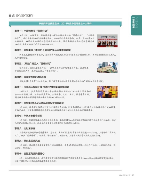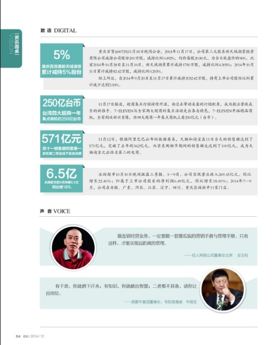 5%,重慶百貨遭新天域湖景累計減持5%股份 重慶百貨(600729)11月18日晚間公告,2014年11月17日,公司第二大股東新天域湖景投資有限公司減持公司股份200萬股,減持比例0.492%,均價每股20.80元,為當(dāng)日收盤價的96%。此前2014年10月28日至11月10日,新天域湖景累計減持1750萬股,減持比例4.305%;2014年10月31日累計減持82.42萬股,減持比例0.203%。 綜上所述,自2014年9月20日至11月17日累計減持2032.42萬股,持有上市公司股份比例累計減少達到5.00%。 250億臺幣,臺灣四大超商一年集點商機約250億臺幣 11月17日報道,超商集點行銷持續(xù)升溫,由過去帶動來客的行銷配角,成為挹注營收成長的新推手。7-ELEVEN與全家兩大超商的集點活動走出各自特色,7-ELEVEN開拓精品商機,全家則攻新興肖像,估四大超商一年集點商機上看250億元(臺幣)。 571億元,雙十一銷售額阿里第一京東第二 帶動線下實體消費 11月12日,根據(jù)阿里巴巴公布的數(shù)據(jù)看來,天貓和淘寶在11日當(dāng)天的銷售額達到了571億元,突破了去年的362億元。而京東購物節(jié)期間的銷售額也達到了100億元,成為天貓?zhí)詫氈笈琶诙碾娚獭?/font> 6.5億,永輝超市前9月凈賺6.5億同比增18% 開店一覽 永輝超市10月30日晚間披露三季報。1—9月,公司實現(xiàn)營業(yè)收入269.45億元,同比增長22.40%;歸屬于上市公司股東的凈利潤6.49億元,同比增長18.00%;2014年7—9月,公司在安徽、廣東、河北、江蘇、遼寧、四川、重慶區(qū)域新開11家門店。 ★聲音 做連鎖經(jīng)營業(yè)務(wù),一定要做一套傻瓜版的營銷手冊與管理手冊,只有這樣,才能實現(xiàn)遠距離的管理。 ——巨人網(wǎng)絡(luò)公司董事會主席 史玉柱 有干勁,你就灑下汗水;有知識,你就獻出智慧;二者都不具備,請你讓出崗位。 ——原蒙牛集團董事長、專職慈善家 牛根生 ★創(chuàng)新 聯(lián)商網(wǎng)年度獨家盤點:2014年度中國零售業(yè)十大事件 事件一:中國購物節(jié)“蓮荷行動” 10月17日,由聯(lián)商網(wǎng)、銀泰商業(yè)等10家企業(yè)聯(lián)合發(fā)起的“蓮荷行動”、“中國購物節(jié)”,吸引了全國136家實體連鎖企業(yè)、16491家門店共同參與,11月11月-11月16日活動期間,44家企業(yè)公布的銷售總額達61.5億元,預(yù)計全部參與企業(yè)總銷售額突破100億元;其中雙11當(dāng)天平均增幅為148.14%。 事件二:阿里美國上市創(chuàng)史上最大IPO 馬云成中國首富 阿里巴巴招股說明書顯示,馬云持有阿里巴巴8.8%股份;還占股小微金服7.3%,其財富估值約256億美元,成中國新首富。 事件三:.萬達廣場邁入“百店時代” 10月31日,第100座萬達廣場一一昆明西山萬達廣場將盛大開業(yè)。這意味著,中國商業(yè)地產(chǎn)第一品牌正式進入“百店時代”。 事件四:國美發(fā)布O2M新戰(zhàn)略 國美電器2月發(fā)布O2M新戰(zhàn)略,即“線下實體店+線上電商+移動終端”的組合式運營模式。 事件五:步步高云猴網(wǎng)上線 打造O2O全渠道營銷模式 10月29日,步步高集團發(fā)布大平臺戰(zhàn)略暨全國首個O2O本地生活服務(wù)平臺——云猴網(wǎng)上線。該平臺涵蓋商品、生活服務(wù)、文化、醫(yī)療、教育等多方面,將為顧客和全體聯(lián)盟商家提供全方位的O2O解決方案。 事件六:阿里集團53.7億港元戰(zhàn)略投資銀泰商業(yè) 3月31日,銀泰商業(yè)集團與阿里巴巴集團聯(lián)合宣布:阿里集團將以53.7億港元對銀泰商業(yè)進行戰(zhàn)略投資。交易完成后,阿里集團將持有銀泰商業(yè)9.9%股份及總額約37.1億元港元的可轉(zhuǎn)換債券。 事件七:華潤萬家整合樂購 5月29日,華潤萬家母公司華潤創(chuàng)業(yè)公告稱,其與英國Tesco簽訂的合資協(xié)議已獲中方相關(guān)部門的批準(zhǔn),雙方已經(jīng)完成籌組合資企業(yè)。新成立的合資企業(yè)銷售額預(yù)計約950億元人民幣。 事件八:功過王宗南 聯(lián)華超市股份有限公司原董事長、總經(jīng)理,上海百聯(lián)(集團)有限公司原總裁——王宗南,上海灘的“商業(yè)教父”。58歲“因病請辭”,卻沒能“平穩(wěn)著陸”! 8月11日,上海市人民檢察院決定逮捕王宗南。 事件九:胖東來關(guān)店風(fēng)波 9月15日,河南胖東來集團董事長于東來微博稱,未來3年胖東來只留一個時代廣場店,一時坊間熱議,唏噓有之,贊賞有之。 事件十:三胞系列并購展雄心 4月,由三胞集團牽頭,旗下南京新百以數(shù)億英鎊收購了英國百年老店House of Fraser(福來莎百貨)89%股權(quán),這是中國民營企業(yè)首次在英國收購零售業(yè)品牌。