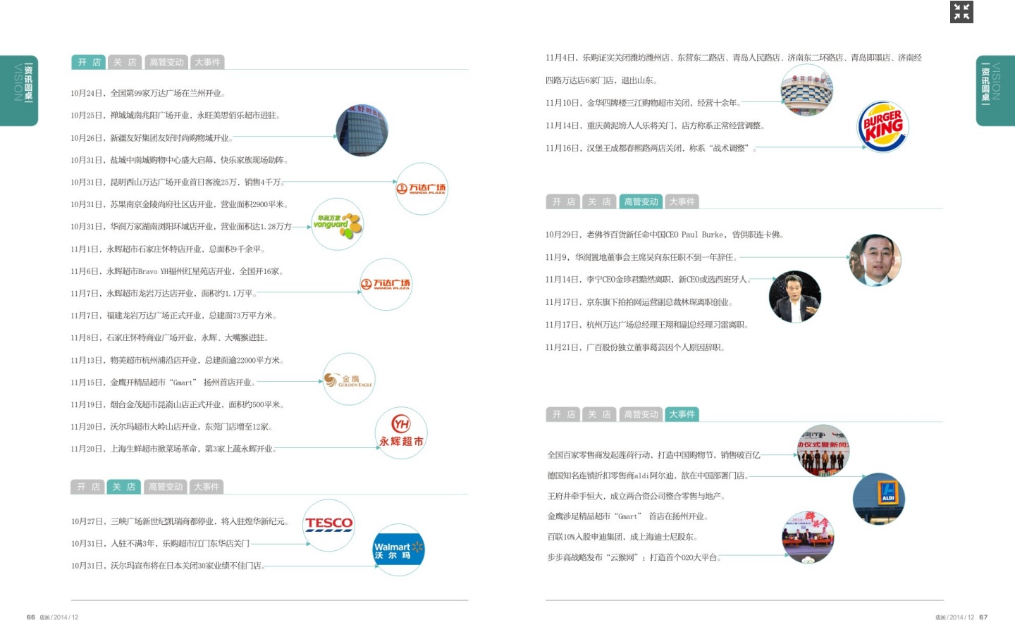 開店 10月24日,全國第99家萬達(dá)廣場在蘭州開業(yè)。 10月25日,禪城城南兆陽廣場開業(yè),永旺美思佰樂超市進(jìn)駐。 10月26日,新疆友好集團(tuán)友好時(shí)尚購物城開業(yè)。 10月31日,鹽城中南城購物中心盛大啟幕,快樂家族現(xiàn)場助陣。 10月31日,昆明西山萬達(dá)廣場開業(yè)首日客流25萬,銷售4千萬。 10月31日,蘇果南京金陵尚府社區(qū)店開業(yè),營業(yè)面積2900平米。 10月31日,華潤萬家湖南瀏陽環(huán)城店開業(yè),營業(yè)面積達(dá)1.28萬方 11月1日,永輝超市石家莊懷特店開業(yè),總面積9千余平。 11月6日,永輝超市Bravo YH福州紅星苑店開業(yè),全國開16家。 11月7日,永輝超市龍巖萬達(dá)店開業(yè),面積約1.1萬平。 11月7日,福建龍巖萬達(dá)廣場正式開業(yè),總建面73萬平方米。 11月8日,石家莊懷特商業(yè)廣場開業(yè),永輝、大嘴猴進(jìn)駐。 11月13日,物美超市杭州浦沿店開業(yè),總建面逾22000平方米。 11月15日,金鷹開精品超市“Gmart” 揚(yáng)州首店開業(yè)。 11月19日,煙臺(tái)金茂超市昆崳山店正式開業(yè),面積約500平米。 11月20日,沃爾瑪超市大嶺山店開業(yè),東莞門店增至12家。 11月20日,上海生鮮超市掀菜場革命,第3家上蔬永輝開業(yè)。 關(guān)店 10月27日,三峽廣場新世紀(jì)凱瑞商都停業(yè),將入駐煌華新紀(jì)元。 10月31日,入駐不滿3年,樂購超市江門東華店關(guān)門 10月31日,沃爾瑪宣布將在日本關(guān)閉30家業(yè)績不佳門店。 11月4日,樂購證實(shí)關(guān)閉濰坊濰州店、東營東二路店、青島人民路店、濟(jì)南東二環(huán)路店、青島即墨店、濟(jì)南經(jīng)四路萬達(dá)店6家門店,退出山東。 11月10日,金華四牌樓三江購物超市關(guān)閉,經(jīng)營十余年。 11月14日,重慶黃泥塝人人樂將關(guān)門,店方稱系正常經(jīng)營調(diào)整。 11月16日,漢堡王成都春熙路兩店關(guān)閉,稱系“戰(zhàn)術(shù)調(diào)整”。 高管變動(dòng) 10月29日,老佛爺百貨新任命中國CEO Paul Burke,曾供職連卡佛。 11月9,華潤置地董事會(huì)主席吳向東任職不到一年辭任。 11月14日,李寧CEO金珍君黯然離職,新CEO或選西班牙人。 11月17日,京東旗下拍拍網(wǎng)運(yùn)營副總裁林琛離職創(chuàng)業(yè)。 11月17日,杭州萬達(dá)廣場總經(jīng)理王翔和副總經(jīng)理習(xí)雷離職。 11月21日,廣百股份獨(dú)立董事葛蕓因個(gè)人原因辭職。 大事件 全國百家零售商發(fā)起蓮荷行動(dòng),打造中國購物節(jié),銷售破百億 德國知名連鎖折扣零售商aldi阿爾迪,欲在中國部署門店。 王府井牽手恒大,成立兩合資公司整合零售與地產(chǎn)。 金鷹涉足精品超市“Gmart” 首店在揚(yáng)州開業(yè)。 百聯(lián)10%入股申迪集團(tuán),成上海迪士尼股東。 步步高戰(zhàn)略發(fā)布“云猴網(wǎng)”:打造首個(gè)O2O大平臺(tái)。