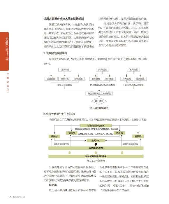 圖1-1傳統(tǒng)零售業(yè)面臨的問題 1.消費(fèi)人群特征變化 據(jù)商務(wù)部商貿(mào)服務(wù)司副司長王選慶稱, “80后、90后將成為高價(jià)值的顧客群,產(chǎn)生新的消費(fèi)價(jià)值觀和新的消費(fèi)方式。這部分新興消費(fèi)群體,將改變零售市場現(xiàn)有的消費(fèi)結(jié)構(gòu)。” 到2015年,80后、90后、銀發(fā)族這部分人的占比將超過40%。 2.同業(yè)惡性競爭 在零售領(lǐng)域,商業(yè)形式與商業(yè)產(chǎn)品的差異性越來越小,因此催生了很多價(jià)格戰(zhàn)等惡性競爭情況,同時由于之前的零售業(yè)極速擴(kuò)張,同業(yè)情況的增長超越了消費(fèi)的增長。 3.電商發(fā)展迅速 上半年我國電子商務(wù)交易額約為5.66萬億元,同比增長30.1%,而全國社會消費(fèi)品零售總額增長的速度卻處于放緩的態(tài)勢,電商的迅速發(fā)展無疑在很大程度上搶占了線下銷售的份額。 4.信息化水平較弱 在中顥潤服務(wù)過的零售業(yè)客戶中,信息化水平普遍較弱,同時在對一些大企業(yè)甚至上市公司做數(shù)據(jù)分析服務(wù)時也發(fā)現(xiàn),即便規(guī)模較大的企業(yè)引進(jìn)了完備的信息化系統(tǒng),但使用的深度,使用的頻次,以及使用的全面性均處于較低水平。 零售業(yè)如何突圍困境 1.經(jīng)營模式的轉(zhuǎn)變 拋開B2C、O2O等形式上的模式,最終不管什么類型的渠道與發(fā)展模式,其核心均為客戶驅(qū)動的經(jīng)營模式。 2.加強(qiáng)客戶解讀 電商之所以發(fā)展迅速,主要由于其瀏覽式的方便,加以電商企業(yè)對信息化的使用深度,使其不斷提升消費(fèi)者的解讀能力,因而可以不斷挖掘其需求,提升客戶體驗(yàn)。目前雖然電商發(fā)展迅速,但主要消費(fèi)市場仍在線下,線下零售企業(yè)若能靈活運(yùn)用互聯(lián)網(wǎng)思維,并不斷提升對于客戶解讀的技術(shù),勢必將優(yōu)勢發(fā)揮到極致,以彌補(bǔ)其不足。 運(yùn)用大數(shù)據(jù)分析技術(shù)落地戰(zhàn)略規(guī)劃 隨著互聯(lián)網(wǎng)的成熟,大數(shù)據(jù)作為新興的概念也在飛速發(fā)展,然而若達(dá)到大數(shù)據(jù)價(jià)值落地,并非引進(jìn)一些大數(shù)據(jù)分析系統(tǒng)或者商業(yè)智能就可以解決存在的問題,大數(shù)據(jù)的分析應(yīng)該嫁接在商業(yè)戰(zhàn)略的基礎(chǔ)之上,然后在大數(shù)據(jù)分析的平臺之上運(yùn)行精細(xì)化的管控?cái)?shù)學(xué)模型才能正確得出分析結(jié)果,進(jìn)而發(fā)揮大數(shù)據(jù)的最大價(jià)值。 無論是國外的梅西百貨、沃爾瑪、塔吉特,還是國內(nèi)的朝陽大悅城、萬達(dá),均在大數(shù)據(jù)分析的建設(shè)上有很大的突破,因此,數(shù)據(jù)分析的價(jià)值顯而易見,但如何才能建設(shè)好大數(shù)據(jù)平臺,中顥潤憑借多年的分析經(jīng)驗(yàn)認(rèn)為主要有以下幾點(diǎn)需要注意和完善。 1.大數(shù)據(jù)的數(shù)據(jù)架構(gòu) 零售業(yè)在建立以客戶為中心的經(jīng)營模式下,中顥潤認(rèn)為應(yīng)設(shè)計(jì)如下的數(shù)據(jù)架構(gòu),如圖1-2所示。