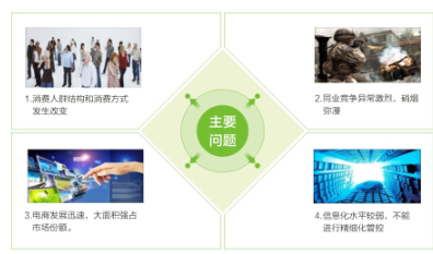 隨著中國人口紅利的逐步至頂,實(shí)體零售業(yè)經(jīng)過十年的變遷,已經(jīng)從20%以上的野蠻式增長,降到現(xiàn)在的10%以內(nèi)增長,增長的萎縮是從事零售業(yè)的商家必須面對的問題。當(dāng)人口紅利不再能延續(xù)企業(yè)的爆發(fā)增長時,決定企業(yè)命運(yùn)的將是企業(yè)的企業(yè)管理、企業(yè)文化、企業(yè)的成本優(yōu)化以及以客戶為導(dǎo)向的營銷模式,實(shí)體零售企業(yè)均需找準(zhǔn)自身的發(fā)展方向,并不斷在行業(yè)內(nèi)的新境況下摸索突破。 2014年傳統(tǒng)零售業(yè)主要面臨以下幾點(diǎn)問題 2014年傳統(tǒng)零售業(yè)主要面臨以下四點(diǎn)問題,如圖1-1所示。