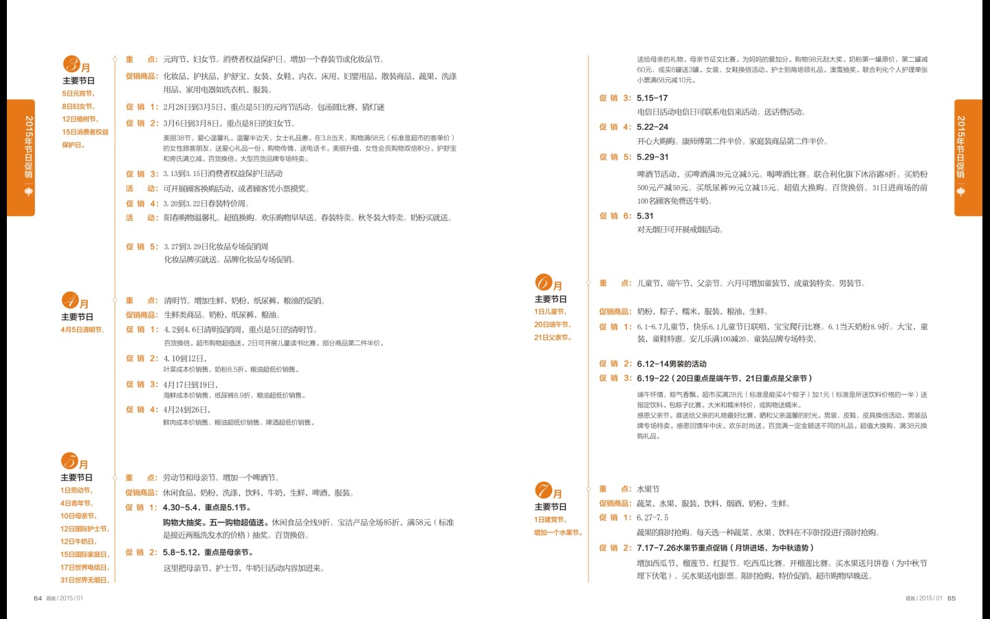 導(dǎo)言:節(jié)日是商場進(jìn)行促銷活動(dòng)的重要節(jié)點(diǎn),把握好節(jié)日的促銷,全年商場活動(dòng)就成功了一半。本文根據(jù)2015年國家法定節(jié)假日,策劃了全年節(jié)日促銷活動(dòng)的安排計(jì)劃,以供讀者參考。 2015年節(jié)日的特點(diǎn): 以公歷時(shí)間為標(biāo)準(zhǔn)的節(jié)日,比較重要的有元旦、五一、國慶;以農(nóng)歷為時(shí)間標(biāo)準(zhǔn)的節(jié)日,比較重要的有春節(jié)、元宵節(jié)、清明、端午、七夕、中秋,冬至等。 大的節(jié)日(主要是中秋和春節(jié))促銷周期可以安排2-3個(gè)月,這個(gè)時(shí)間段內(nèi)可以進(jìn)行活動(dòng)準(zhǔn)備、商品進(jìn)場、活動(dòng)宣傳,沖刺活動(dòng)高潮(如特價(jià)周,搶購周)等;中等的節(jié)日(包括元旦、七夕、端午、清明、五一、國慶、圣誕節(jié)、兒童節(jié)、情人節(jié)、婦女節(jié)、元宵節(jié)、冬至等)則可以安排1周到半月的促銷周期;小的節(jié)日最多3-5天的促銷周期,有的節(jié)日就一天的時(shí)間。2015年春節(jié)與元旦相距的遠(yuǎn),元旦與春節(jié)要分開做促銷,如果要連起來做促銷,中間一定要串其他的促銷活動(dòng),讓活動(dòng)有起伏。2015年的中秋節(jié)與國慶節(jié)相近,可合起來做一個(gè)跨月的大促銷。對(duì)2015年來說,一年中的重點(diǎn)在2月和9月。同時(shí)也要有節(jié)過節(jié),無節(jié)造節(jié),通過造節(jié)來擴(kuò)大商場的銷售面和銷售量。 1月 主要節(jié)日:元旦,27日臘八節(jié), 重點(diǎn):核心促銷節(jié)日,元旦、春節(jié)(已經(jīng)啟動(dòng)了春節(jié)的銷售) 促銷商品:年貨,冬季用品,保曖用品,床用,煙酒,湯圓,保健品,茶葉,禮籃;水果,蔬菜,鮮肉,水產(chǎn),巧克力,湯圓。 促銷1:2014.12.20——2014.12.25呈上啟下周,從2014年12月20日開始,這次因?yàn)榱?xí)總書記親到澳門慶祝,可以加大宣傳。從12月20日開始也是2015年年貨銷售的開始。22日是冬至,加大湯圓和配屬品的銷售,24日平安夜,加大平安果的銷售,25日圣誕節(jié),加大紅酒,巧克力的銷售。通過年底會(huì)員卡返利,加大會(huì)員卡的宣傳和促銷。 促銷2:2014.12.26——2014.12.30元旦準(zhǔn)備加熱周,通過26日毛澤東誕辰日加大煙酒,茶葉,新鮮食品的銷售。 促銷3:2014.12.31——2015.1.3元旦搶購周,注意元旦活動(dòng)一定是從31日開始的,31日可以是通過活動(dòng)進(jìn)行宣傳,讓元月1.2.3號(hào)的銷售更上一層樓。這里主要強(qiáng)調(diào)的是貨源,一定要貨源充足。 活動(dòng):三羊開泰,羊年吉祥,獎(jiǎng)平版電腦。新年新驚喜,折扣也任性。微信發(fā)紅包,羊年夠任性。幸福羊帆,千元紅包天天送。時(shí)尚也任性,百貨1換3.6倍。元旦特惠搶購,超低價(jià)限時(shí)搶購。元旦4天刮獎(jiǎng)。元旦當(dāng)天奶粉8.5折。 促銷4:元月9日到11日,16日到18日,23日到27日,這里分三個(gè)階段(是周五到周日),也是三個(gè)層次,一是宣傳(9-11),二是低價(jià)(16-18),三是瘋搶(23-27)。也可以是年貨特價(jià)的力度在不斷加大。也是年貨重點(diǎn)促銷階段,低價(jià),量大,促銷是這一階段的重點(diǎn)。 活動(dòng):開心購物大換購。春節(jié)年貨大搶購。購物滿158元(標(biāo)準(zhǔn)是客單價(jià)的2--3倍)送20元的年貨提貨卡。周末購物超值送。奶粉第二罐半價(jià)。購買強(qiáng)生、美肌潤膚霜、潤膚露滿30元立減5元(買滿的標(biāo)準(zhǔn)是超一支的價(jià)格)。買徐福記糖果滿38元(標(biāo)準(zhǔn)是超半斤的價(jià)格)減5元。邦寶適、海飛絲、汰漬碧浪第二件半價(jià)優(yōu)惠。春節(jié)禮籃團(tuán)購優(yōu)惠。 這三個(gè)階段也是年貨的搶購階段,主要保證有貨供應(yīng)。春節(jié)禮籃團(tuán)購優(yōu)惠一定要強(qiáng)調(diào)優(yōu)惠的力度。 2月(一年中的重點(diǎn)) 主要節(jié)日:2015年2月18日到24日春節(jié)法定假日,14日情人節(jié), 重點(diǎn):2月18日到24日的春節(jié)活動(dòng)安排;14日情人節(jié)。 促銷商品:年貨,煙酒,保健品,茶葉,禮籃;水果,蔬菜,鮮肉,水產(chǎn)。情人節(jié)套裝、紅酒、巧克力;湯圓。 促銷1:2月1日到8日春節(jié)特價(jià)周。強(qiáng)調(diào)低價(jià),吸引團(tuán)購,從2014年12月20日開始到2015年3月5日(元宵節(jié))重點(diǎn)是銷售春節(jié)年貨;要有大型的百貨和超市活動(dòng)。 活動(dòng):百貨幾倍(有1.5到3.5倍),超市買幾送幾,打折,購物送紅包,新春送利是,春節(jié)禮籃團(tuán)購優(yōu)惠。 促銷2:2015年2月9日到15日春節(jié)商品搶購周。2月12日為小年,14日為情人節(jié)。 活動(dòng):,百貨購物折后滿215元參與刮獎(jiǎng)活動(dòng)。 促銷3:16日到18日為新鮮的毛利日。特別是18日,利用這幾天顧客要新鮮商品不講價(jià)的特點(diǎn),加大毛利。商品有鮮肉,鮮魚,新鮮蔬菜,水果,同時(shí)主要強(qiáng)調(diào)是新鮮的貨量。 促銷4:19日到24日為春節(jié)禮品周。春節(jié)禮籃團(tuán)購優(yōu)惠。煙酒,茶葉,保健品,水果加大促銷力度。19、20、21日春節(jié)購物送紅包。 3月 主要節(jié)日:5日元宵節(jié),8日婦女節(jié),12日植樹節(jié),15日消費(fèi)者權(quán)益保護(hù)日。 重點(diǎn):元宵節(jié),婦女節(jié)。消費(fèi)者權(quán)益保護(hù)日。增加一個(gè)春裝節(jié)或化妝品節(jié)。 促銷商品:化妝品,護(hù)扶品,護(hù)舒寶,女裝,女鞋,內(nèi)衣