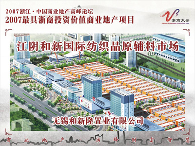 江陰和新國際紡織品原輔料市場位于江陰月城物流園區(qū)內(nèi),占地面積約400多畝,總建筑面積80000平方米,計劃首期投入1.5億元人民幣。目的是建立長三角地區(qū)最大的紡織品原料、服飾面輔料的現(xiàn)貨交易、倉儲、物流配送、商務(wù)信息于一體的綜合性交易中心。
