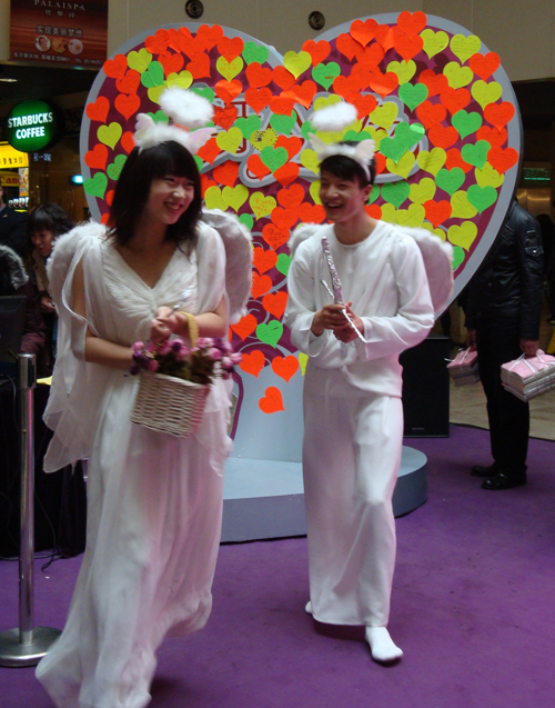 2月14日,空氣里充滿了粉紅色浪漫的味道,每個(gè)人的心里都裝滿了祝福和情話,每個(gè)人臉上都寫滿了幸福和如意。銘澤2.14情人節(jié)“鉆飾真愛情誼永恒”大型主題活動(dòng)在呼和浩特市維多利購物中心展開。 大賽吸引了眾多商場(chǎng)購物的顧客駐足觀看,比賽現(xiàn)場(chǎng)舉行了“愛要大聲說出來”、“愛情對(duì)對(duì)碰”等精彩的互動(dòng)游戲。 熱吻大賽活動(dòng)現(xiàn)場(chǎng)的主要負(fù)責(zé)人杜文軍說:“今天是情人節(jié),舉辦這個(gè)活動(dòng)是為了讓現(xiàn)場(chǎng)觀眾為參賽者見證、記錄這感人的一刻,為您的生活增添浪漫色彩,祝天下有情人終成眷屬。” 據(jù)了解,此次熱吻大賽獲得第一名的情侶是在2008年參加銘澤主辦的萬人相親大會(huì)上相識(shí)并相戀的。 2月13日,情人節(jié)前夕,各商家紛紛想出辦法緊抓商機(jī)。某商家在商場(chǎng)內(nèi)為情人們奉獻(xiàn)上一場(chǎng)婚紗展,此展覽將持續(xù)三天,模特每天將分時(shí)段在商場(chǎng)T臺(tái)上為顧客展示多樣婚紗。(中新社發(fā) 富田 攝) 2月14日,杭州市首屆情人節(jié)“牛吻”大賽在武林銀泰、西湖銀泰、杭州百貨大樓三地同時(shí)舉行,活動(dòng)吸引了80對(duì)情侶前來參加。中新社發(fā)引煒 。2月14日晚,廣西南寧市一家商場(chǎng)舉辦的接吻大賽中,六對(duì)情侶不斷變換各式接吻姿勢(shì)一決高低。最終一對(duì)“90后”最終憑借千奇百怪的接吻姿勢(shì),在激吻近半小時(shí)后奪冠。中新社發(fā) 王剛 攝) 今年情人節(jié)恰好趕上了周六,京城商家花招迭出制造“浪漫”吸引人氣。創(chuàng)意接吻大賽、情歌對(duì)唱比賽、“最深情愛情宣言”評(píng)選,黃金珠寶商家推出的活動(dòng)五花八門、創(chuàng)意十足。 在新世界青春館廣場(chǎng)前,六對(duì)“勇敢”情侶參加的“一吻定情”接吻大賽,吸引了眾多顧客圍觀。與平常的接吻不同,男女雙方在接吻的同時(shí),男方必須抱起女方,女方則摟住男方的脖子,最終經(jīng)過兩小時(shí)的熱吻,一對(duì)年輕的情侶在大家的掌聲中獲得了價(jià)格近2000元的IPOD Touch獎(jiǎng)品。 菜百公司情人節(jié)限量推出特價(jià)紅寶石吊墜(999元、1999元),寓意長長久久。購買黃金對(duì)戒、對(duì)墜和鉑金對(duì)戒、鉆石對(duì)戒等“成對(duì)商品”的情侶,還可以領(lǐng)取“中國結(jié)編織手鏈”一對(duì)。菜百公司還與中國金幣總公司獨(dú)家推出金幣個(gè)性化訂制項(xiàng)目,將情侶的照片彩印在限量發(fā)行的紀(jì)念章上面。 國華商場(chǎng)特設(shè)的情人節(jié)專柜中各式各樣的情侶飾品讓人眼花繚亂:樣式齊全的金飾銀飾對(duì)戒、造型多變的銀飾情侶項(xiàng)鏈、款式時(shí)尚的情侶手機(jī)鏈等。在中友百貨,童心未泯的情侶可以到一層參加趣味情侶模型合影,可獲贈(zèng)1張5寸照和兩張錢包照。情侶們還可將表白發(fā)送至中友短信平臺(tái),通過店內(nèi)電視視頻即時(shí)播放,向愛人表達(dá)愛意。 記者了解到,新世界商場(chǎng)、中友百貨、當(dāng)代商城、西單商場(chǎng)、百貨大樓、貴友各店、翠微大廈、金源新燕莎MALL等眾多女裝品牌商家紛紛發(fā)起一波新的促銷活動(dòng),有購物送玫瑰花的,有送價(jià)值千余元大禮的,還有直接打折的活動(dòng)。 眾多商家紛紛延長營業(yè)時(shí)間,藍(lán)島大廈昨天延長營業(yè)時(shí)間到晚上11點(diǎn)。東方新天地昨天營業(yè)時(shí)間延至今天凌晨1點(diǎn)。新世界商場(chǎng)昨天營業(yè)時(shí)間則延長到晚上12點(diǎn)。 空氣中到處都彌漫著愛情的味道,王府井大街的某大型購物中心正熱鬧非凡,商場(chǎng)中央廣場(chǎng)上的“愛情天使”正在將愛傳遞給大家。 |
