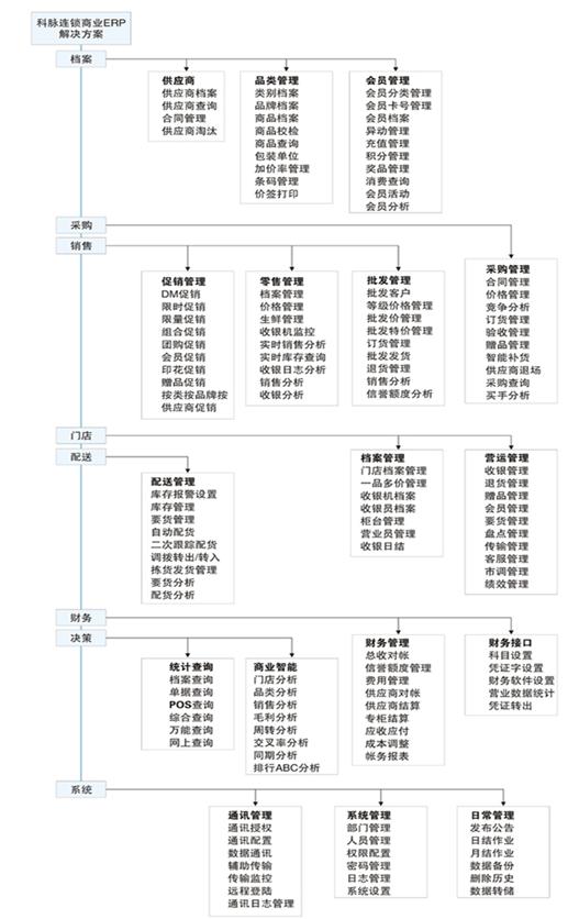 概述:連鎖超市/便利店解決方案是科脈在多年商業(yè)ERP研發(fā)的經(jīng)驗基礎(chǔ)之上,以科脈商業(yè)管理軟件連鎖版產(chǎn)品為平臺,專門為現(xiàn)代零售流通業(yè)中大型、集團化零售連鎖企業(yè)提供的信息化解決方案。本方案可按照零售連鎖企業(yè)的組織架構(gòu)靈活地配置系統(tǒng),將整個集團化企業(yè)的物流、資金流、信息流緊密地整合起來,實現(xiàn)營運控管、物流配送、門店管理、供應鏈管理、行政管理等,同時以豐富強大的商業(yè)智能決策分析系統(tǒng)為企業(yè)的管理層提供決策支持。