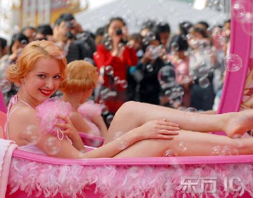 杭州一商場上演“金發(fā)美女”街頭浴缸秀