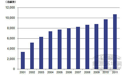 例如,從便利店領(lǐng)域來看,在10年前的2002年,中國僅主要連鎖便利店就約有5000家。到2011年,其數(shù)量已經(jīng)增加到1萬家以上。
