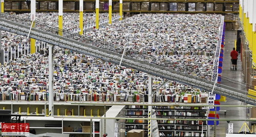 近年來,“網(wǎng)絡(luò)星期一”成為美國每年最火爆的網(wǎng)購日。美國康姆斯科分析公司預計今年“網(wǎng)絡(luò)星期一”將成為歷史上最大的網(wǎng)購日,銷售額可能達到15億美元,比去年“網(wǎng)絡(luò)星期一”增長20%。圖為11月26日,在美國菲尼克斯的亞馬遜公司裝貨中心,一名員工走過貨架旁邊。