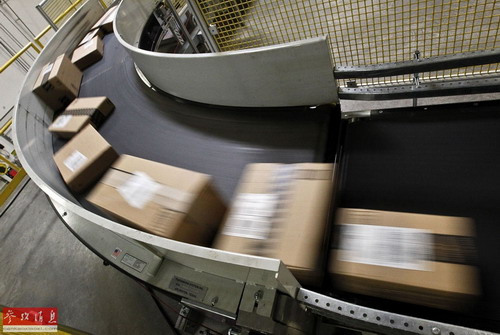 11月26日,在美國菲尼克斯的亞馬遜公司裝貨中心,裝箱的商品在傳送帶上移動。