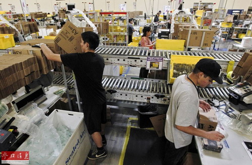 11月26日,在美國菲尼克斯的亞馬遜公司裝貨中心,員工為“網(wǎng)絡(luò)星期一”的訂單發(fā)貨。