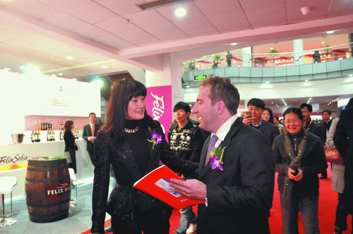 宗慶后之女宗馥莉(左一)出現(xiàn)在娃歐歐洲精品商場開業(yè)典禮上,正與外賓進行熱情交流。