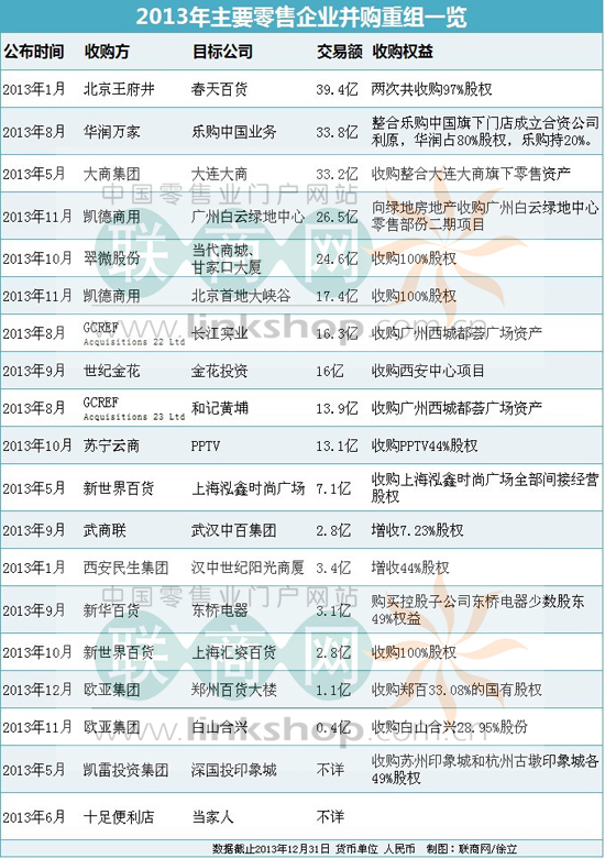 獨(dú)家:2013年主要零售企業(yè)并購(gòu)重組一覽