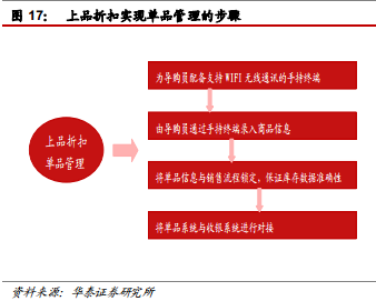 作為北京地區(qū)一家品牌折扣連鎖百貨,上品折扣經(jīng)營(yíng)門類涵蓋百貨業(yè)態(tài)的主要商品品類。公司在北京現(xiàn)擁有8家連鎖門店,2009年上線 “上品折扣網(wǎng)”,也已在移動(dòng)端進(jìn)行了布局。為實(shí)現(xiàn)單品管理,上品折扣從硬件、軟件等方面著手,通過(guò)調(diào)動(dòng)既有人力資源(專柜導(dǎo)購(gòu)員),重新梳理了日常經(jīng)營(yíng)管理流程。公司首先實(shí)現(xiàn)了專柜/供應(yīng)商商品全方位信息(款式、庫(kù)存、動(dòng)銷情況等)的動(dòng)態(tài)跟蹤。基于該信息系統(tǒng),公司后期還將線上渠道與線下數(shù)據(jù)打通,實(shí)現(xiàn)線上線下商品、庫(kù)存及物流信息的實(shí)時(shí)傳輸和共享。公司目前線上線下SKU的重合度在90%以上,線上銷售占比超過(guò)10%,成為公司重要的業(yè)務(wù)補(bǔ)充。