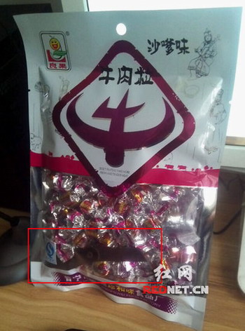據(jù)其介紹,他家住郴州資興市新區(qū)某小區(qū),1月底他家人在小區(qū)附近的小超市,購(gòu)買了5包由廣東普寧市梅塘珍和味食品廠生產(chǎn)的牛肉干。牛肉干的品牌名為“良果”,每包重量為65克,包裝袋上均為“QS”標(biāo)識(shí)。春節(jié)假期期間,家人把牛肉干拿出來(lái)給親友們食用時(shí),細(xì)心地丁先生發(fā)現(xiàn),其中一袋未拆封的牛肉干竟藏有一片生銹的刀片。