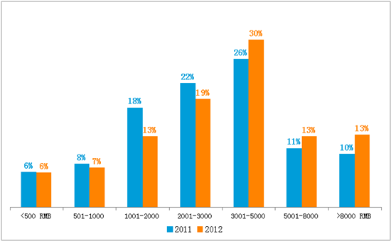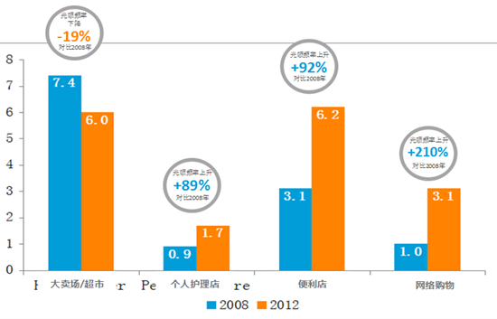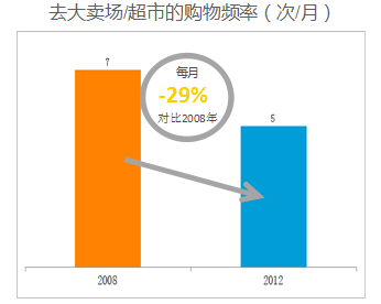 從2008年到2012年的5年間,購物者去大賣場/超市購物的頻率在下降,但每一次購物的門店選擇則在增多,競爭越加激烈。