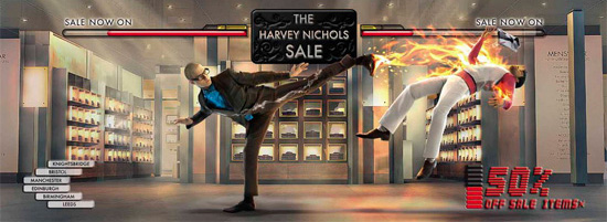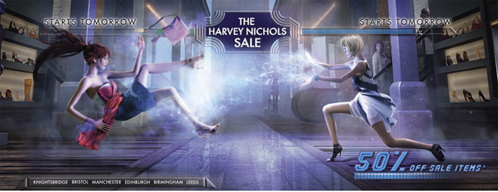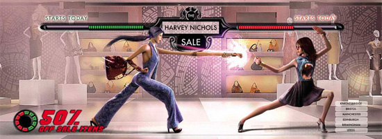 為了吸引眼球,這家百貨公司費(fèi)盡心思,Harvey Nichols發(fā)言人表示期望通過(guò)最原始的表達(dá)方式來(lái)向消費(fèi)者傳達(dá)促銷(xiāo)信息。廣告沿用經(jīng)典格斗游戲《真人快打》和《街霸》的風(fēng)格,并配以商店賣(mài)場(chǎng)做背景,體現(xiàn)出為購(gòu)物而戰(zhàn),而搶購(gòu)折扣商品而戰(zhàn)的激烈氛圍。