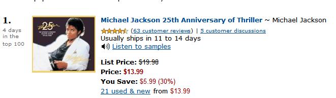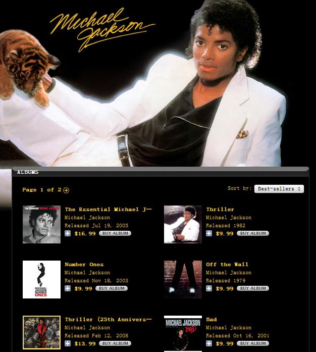 在線零售網(wǎng)站amazon.com也在第一時(shí)間內(nèi)推出邁克爾.杰克遜有關(guān)商品的專題頁(yè)面。MUSIC頻道中顯示的Bestsellers in Music 前12張都是Michael Jackson歷年出版的專輯或經(jīng)典合集,截至當(dāng)日以蟬聯(lián)4天的桂冠。
