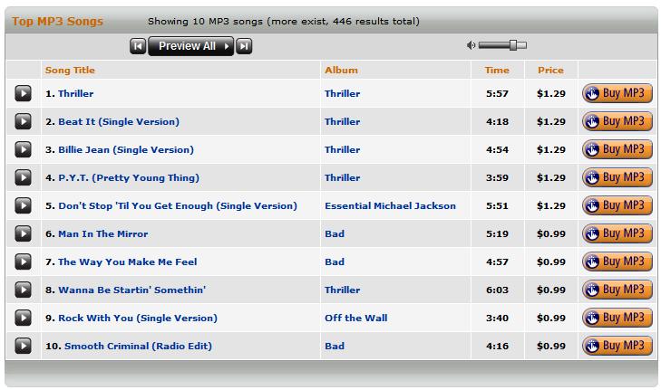 amazon.com網(wǎng)站上熱銷的杰克遜單曲,零售價(jià)分1.29美元、0.99美元兩檔