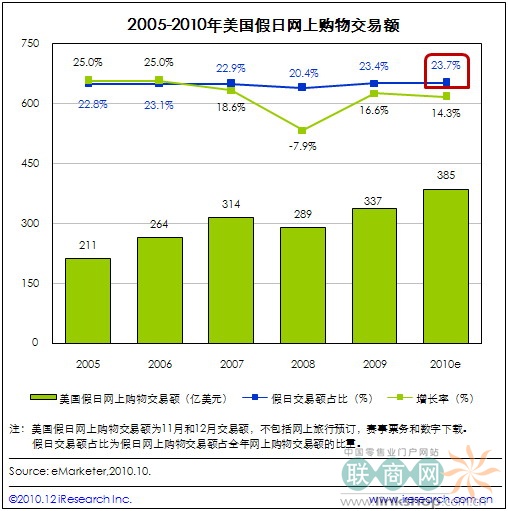數(shù)據(jù)顯示,2009年美國(guó)假日網(wǎng)上購(gòu)物交易額為337億美元,占全年網(wǎng)上購(gòu)物交易總額的23.4%,較08年增長(zhǎng)3%,而2010年美國(guó)假日網(wǎng)上購(gòu)物交易額達(dá)到385億美元,占全年網(wǎng)上購(gòu)物交易總額的23.7%,較09年增長(zhǎng)0.3%。