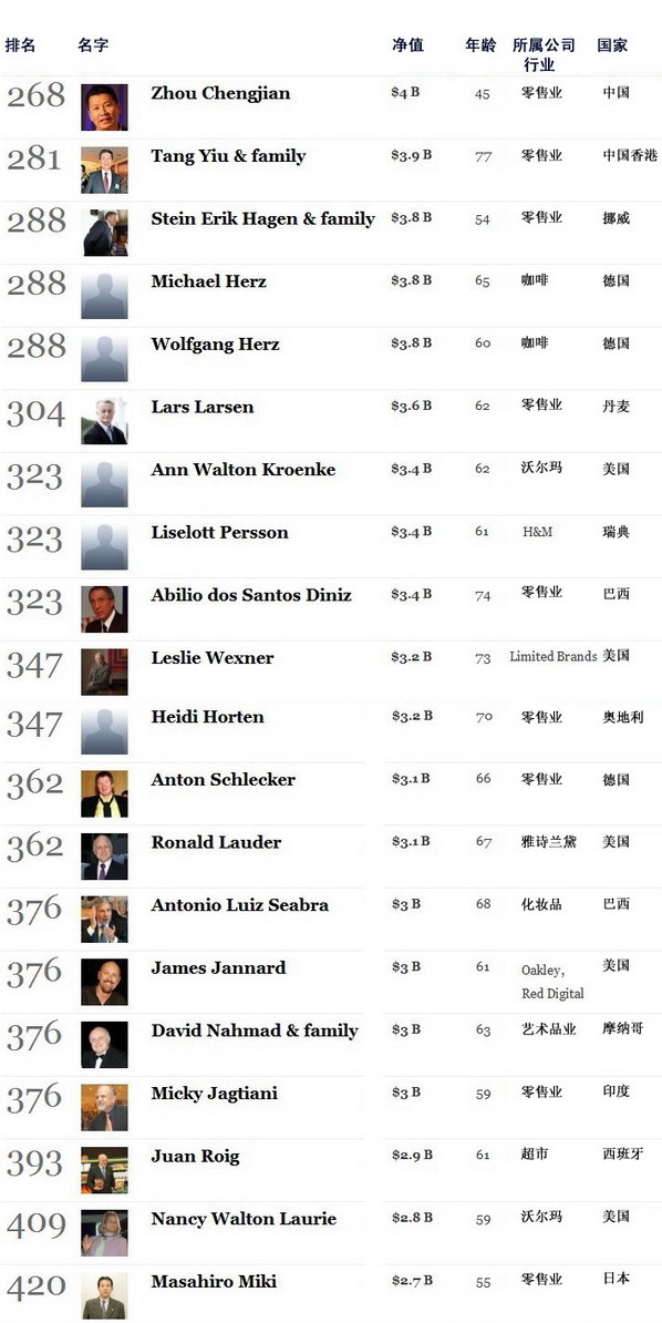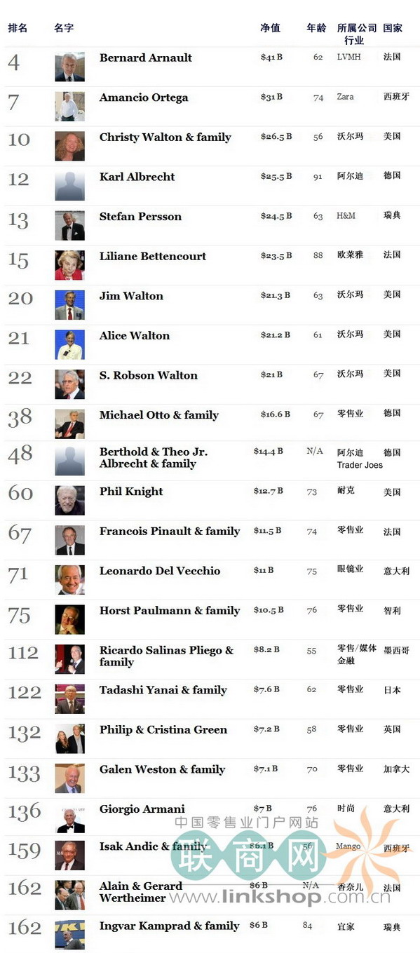 該榜單在福布斯2011年TOP1000富豪榜的基礎(chǔ)上整理出的完整版零售業(yè)、時(shí)尚、服飾業(yè)相關(guān)產(chǎn)業(yè)的富豪排名。