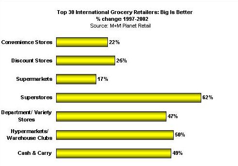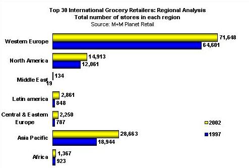 (聯(lián)商網(wǎng)編譯)在過去10年中,“M+M星球零售業(yè)研究機(jī)構(gòu)”一直跟蹤調(diào)查世界上最大的食品零售商家在全球的發(fā)展。利用我們公司詳盡而全面的零售商檔案數(shù)據(jù)庫,我們分析了國際上30個知名食品商在世界各地所開的商店類型(注:根據(jù)零售業(yè)態(tài)分類),并對全球零售市場的結(jié)構(gòu)和零售商的發(fā)展策略有了一個清晰的描繪。為了這次研究,我們排除了那些非食品類的專賣店如電器商店,服飾店,DIY商店和陳設(shè)品店。 統(tǒng)觀全球 在過去五年中,國際零售30強(qiáng)所開的食品類相關(guān)的商店總數(shù)增加了23%。到2002年,商店總數(shù)由1997年的98,723間上升到122,000間。大型零售店模式是主要增長源,該類型包括大型超級市場、超大型自助百貨商場/倉儲會員店,現(xiàn)金支付運(yùn)輸自理式和百貨商店等。這種向大規(guī)模、大營業(yè)面積發(fā)展的趨勢又以ITM、奧桑(Auchan),阿霍德(Ahold) 和瑞威(Rewe)最為顯著。 然而,我們也不應(yīng)該忽略小型零售店模式的作用。一般的自選商場、折扣商店和便利店仍是零售商成功打入某個市場或者填補(bǔ)成熟市場空隙的戰(zhàn)略載體。