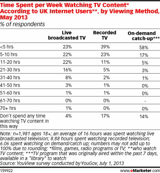 根據(jù)YouGov,英國(guó)網(wǎng)民一周觀看電視直播節(jié)目平均16小時(shí),外加8.8小時(shí)的錄播電視,6.06小時(shí)的點(diǎn)播電視或重溫?梢姺莻鹘y(tǒng)的電視觀看時(shí)長(zhǎng)僅比直播少1個(gè)小時(shí)左右。