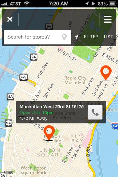 以Home Depot的APP為例,這個零售商的APP提供了店內地圖功能可以幫助用戶快速找到所需產(chǎn)品。另外這個應用還在首頁提供了一個大大的搜索條讓用戶可以快速輸入想查找的產(chǎn)品。而且還提供了語音輸入的功能,以免那些懶惰的男性用戶不想輸入。店鋪定位功能則彈出浮層凸顯喚起行動按鈕,營業(yè)時間和離消費者的距離等信息。