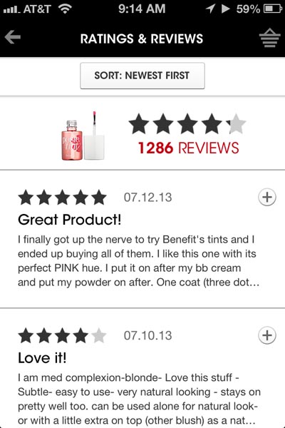 Sephora就是一家通過評論和推薦產(chǎn)品的移動體驗牢牢攻克女性用戶的零售商。Sephora的iPhone應用包括了大的喚起行動按鈕,用戶可以閱讀到這個產(chǎn)品的所有評論,而且這些評論還可以根據(jù)評分,有用程度或發(fā)表日期排序。